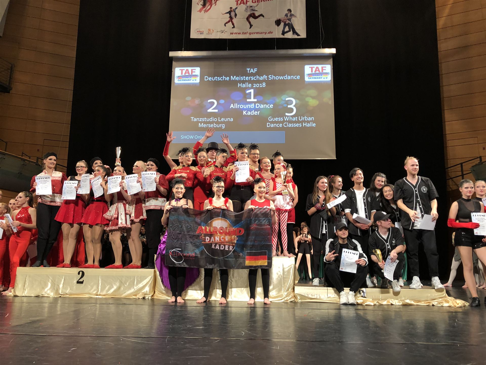 Besonders zu erwähnen sei noch die Gewinner-Company „Allround Dance Kader“ von der Tanzschule Allround aus Dallgow-Döberitz, die den ersten TAF Deutschen Meister „ShowOnly“ stellten. In dieser neuen Klasse, in denen keine Technik-Punkte vergeben werden, gingen direkt acht unterhaltsame Teams an den Start, die das Publikum bestens unterhielten. Von Hip Hop Moves über Russendisko bis zur Sieger-Show „The Greatest Showman“ war alles dabei.