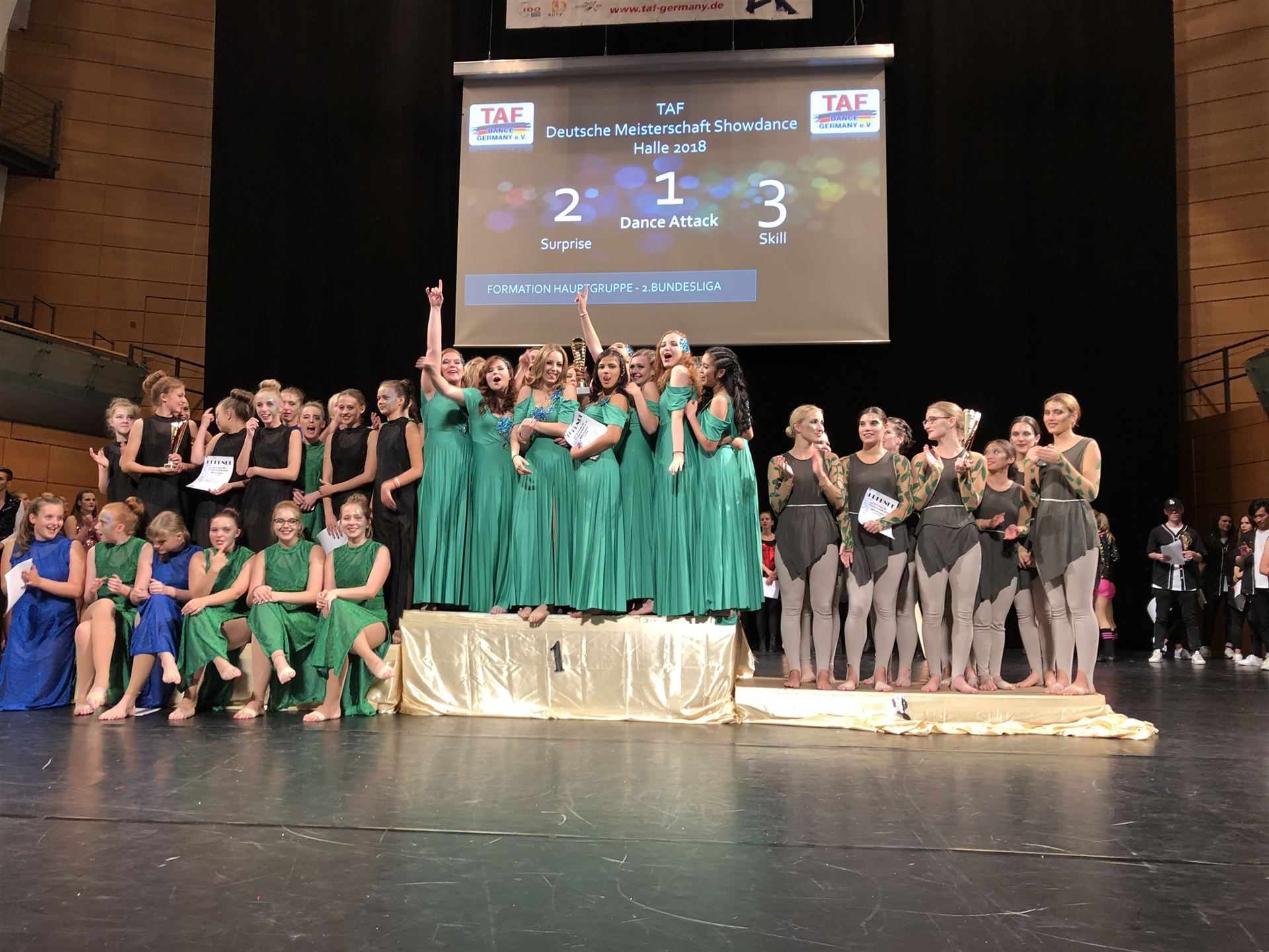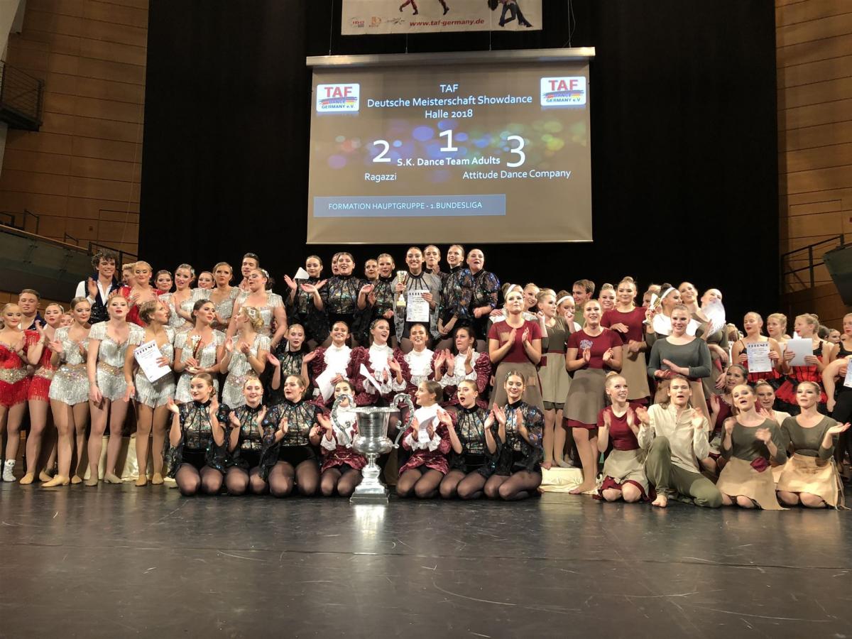 Während die Teilnehmer der Ballett-DM bereits ihre WM Fahrkarten nach Polen ertanzt haben, müssen die Showdancer noch die bald folgenden Turniere in Leverkusen und Bonn abwarten, wo die letzten Ranglistenpunkte gesammelt werden können, um am kommenden World Cup in Riesa teilzunehmen. Bei den Formationen wird bekanntlich immer ein Jahr im Voraus geplant. Hier gab es bei jetzigen DM einen neuen Deutschen Meister. Beim "S.K. Dance Team" aus dem gleichnamigen Tanzstudio in Leverkusen war die Freude riesengroß zum ersten Mal den Titel in der höchsten Showdance Turnierklassen der Erwachsenen (Hauptgruppe) einzufahren. Mit „Bohemian Rapsody“ gewann das Team vor den Mannschaften aus Limburg und Kiel, die auf dem zweiten und dritten Platz landeten. Außerdem nahmen sie den begehrten TAF Wanderpokal mit nach Hause. Auch in weiteren Altersklassen und Kategorien waren die Leverkusener auf Sieg programmiert und führten den Medaillenspiegel des Showdance Turniers an.