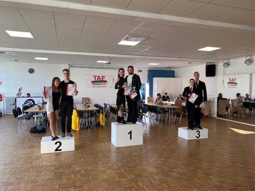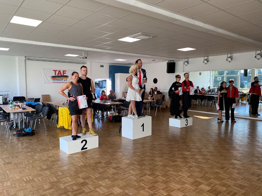 Mit 35 Starts im TAF Turnier und 9 Starts im Hobbyturnier blieb die Zahl der Teilnehmer zwar deutlich hinter den Startzahlen aus Zeiten vor Corona, aber die Paare, die den Weg nach Oberhausen aus ganz Deutschland auf sich genommen hatten, waren alle top motiviert und zeigten sehr gute Leistungen auf dem Parkett.
