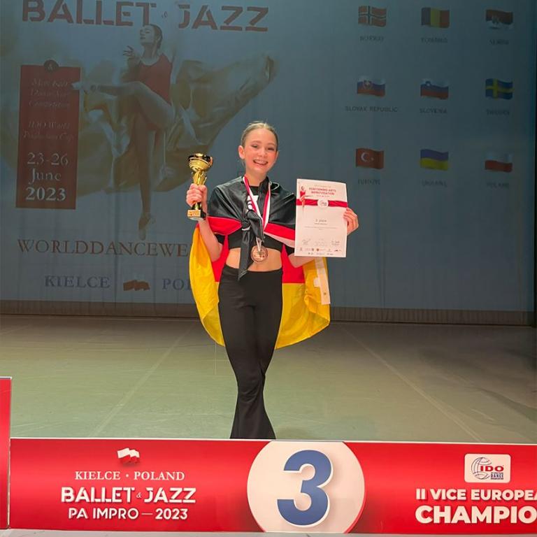 Christian Weiß (TSC Recklinghausen) konnte gleich zwei dieser Medaillen ertanzen! Für ihn hieß es Vize-Europameister im Modern& Contemporary bei den Männer-Solos der Erwachsenen (20 Starter) und Bronze für sein Jazz-Solo. Bei den Erwachsenen Solistinnen im Modern & Contemporary ist die Konkurrenz bekanntlich viel größer und war in diesem Jahr mit 53 Tänzerinnen besonders groß und stark. Valentina Wiesener (Tanzhaus ad libitum, Halle) konnte sich durchsetzen und tanzte sich bis in die Finalrunde. Dort hieß es dann Platz 4 und somit ganz knapp am Treppchen vorbei! Einen weiteren vierten Platz bei sehr starker Konkurrenz (41 Starterinnen) gab es für Loona Höft (Coswiger Kinderzentrum) bei den Junioren-2 Solistinnen im Jazz.