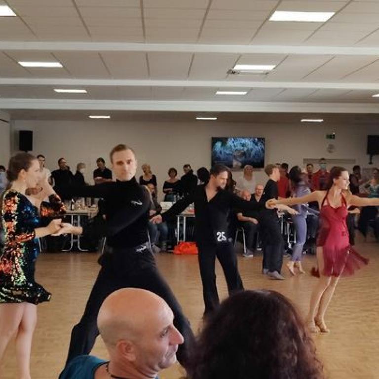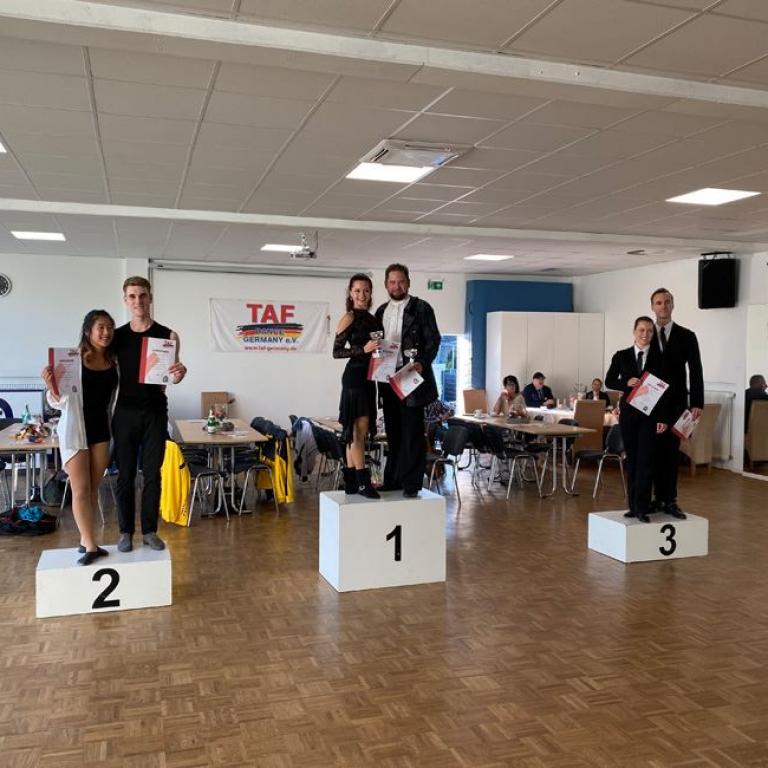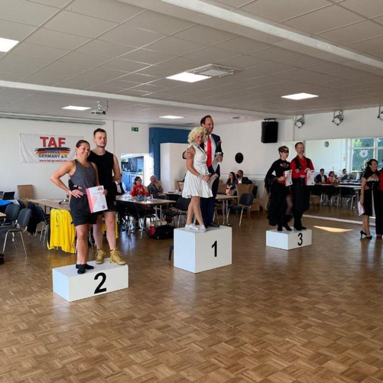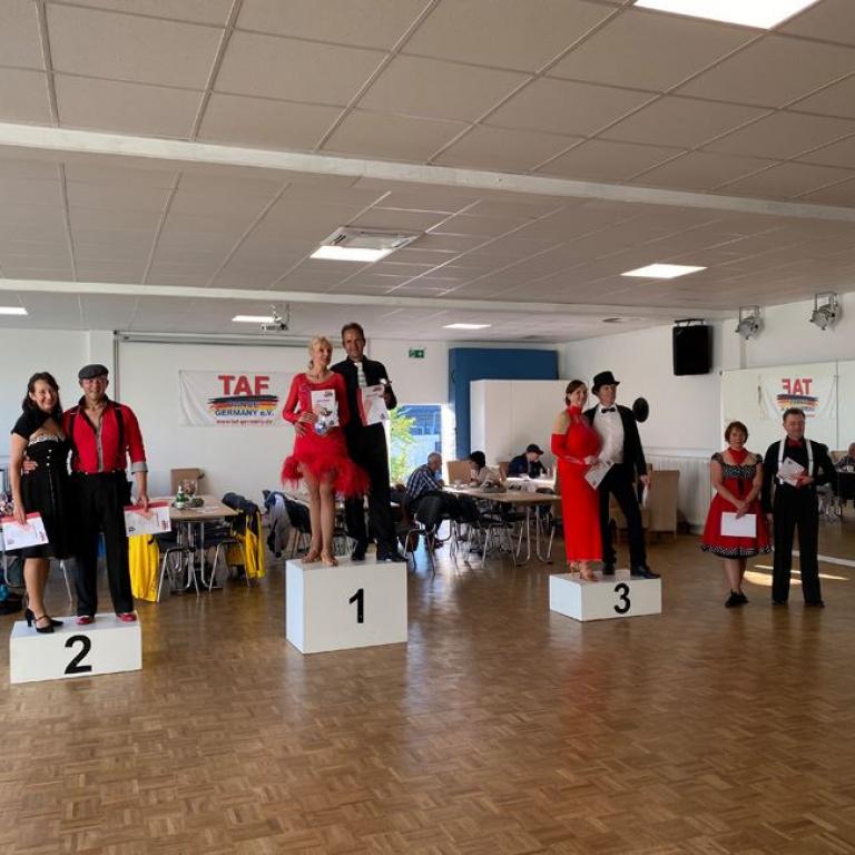 Mit 35 Starts im TAF Turnier und 9 Starts im Hobbyturnier blieb die Zahl der Teilnehmer zwar deutlich hinter den Startzahlen aus Zeiten vor Corona, aber die Paare, die den Weg nach Oberhausen aus ganz Deutschland auf sich genommen hatten, waren alle top motiviert und zeigten sehr gute Leistungen auf dem Parkett.