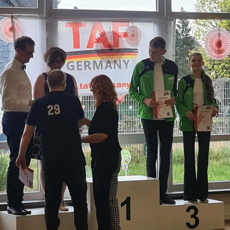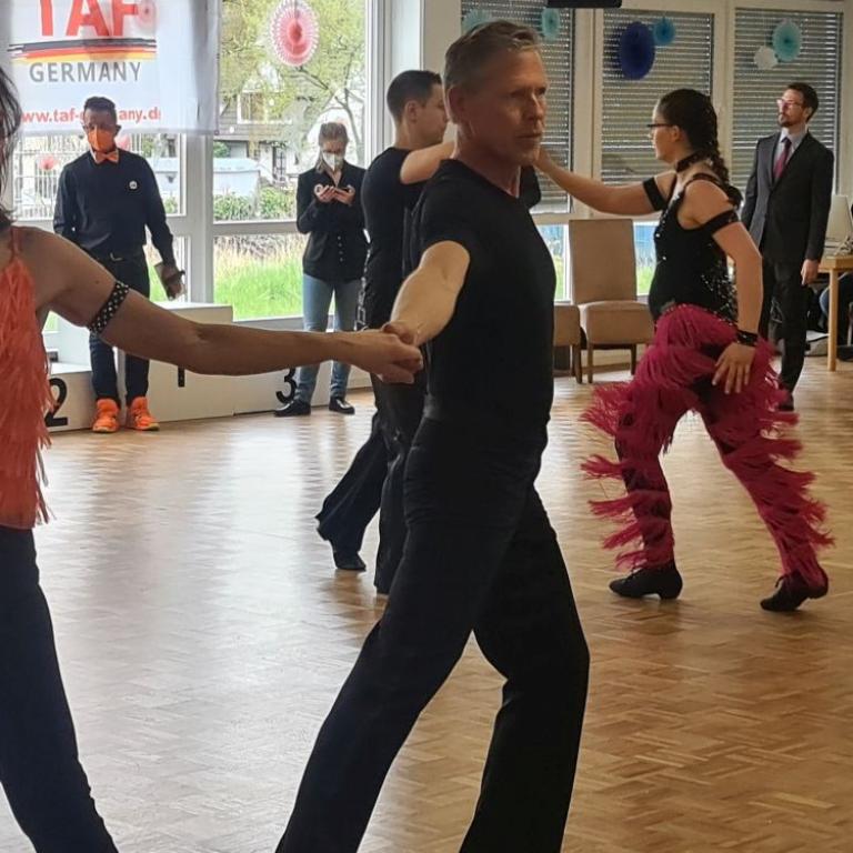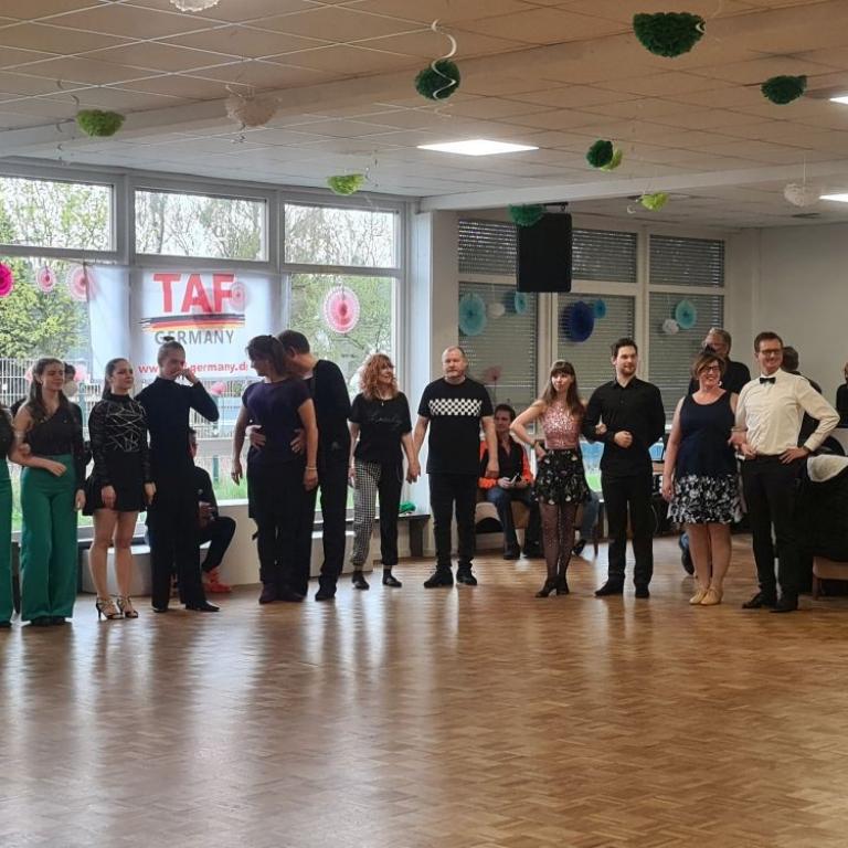 Wer beim diesjährigen Ruhrpottpokal den Saal betrat, musste sich zunächst fragen, warum sich so viele gleich-gekleidete Personen im Raum befanden. Moderator Steffen Schulte-Ortbeck und TAF Discofox Ressortleiter José-Fco. Esquinas-Gómez sorgten für die Aufklärung. Eingebettet in das TAF Turnier war die diesjährige TAF Wertungsrichterschulung Discofox, die das erste Mal seit Corona wieder in Präsenz stattfinden konnte.
